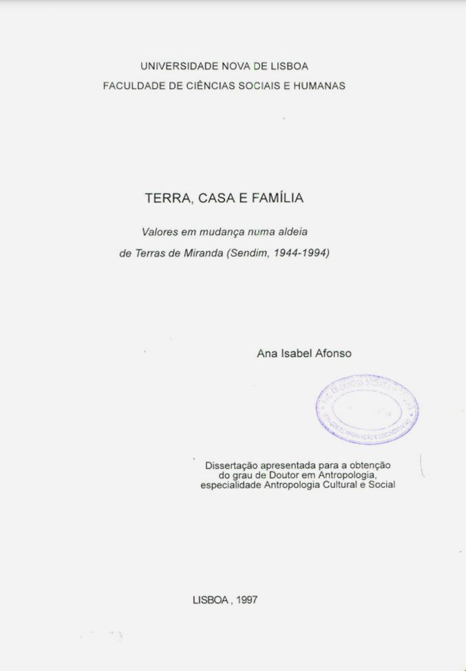 AFONSO, A. (1997) Terra, Casa e Família – Valores em mudança numa aldeia de Terras de Miranda. (Sendim, 1944-1994), Doutoramento em Antropologia, Universidade Nova de Lisboa, Faculdade de Ciências Sociais e Humanas: Lisboa
